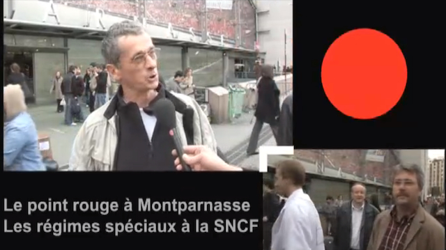 la vidéo point rouge à Montparnasse bloque à 5'28. cela vient de chez vous ou de chez moi ?!? sur le shot de présentation il y a Xavier Renou des Désobéissants, groupuscule gauchiste né d'un schisme au sein de Greenpeace et qui sous couvert de la lutte contre le nucléaire (notamment militaire) s'active beaucoup pour l'autopromotion de Xavier Renou himself ("chercheur en géostratégie"). j'aurais tellement aimé connaître son avis sur ce mouvement social et sous quelle qualité il s'est présenté à JPL ! ! ! les 5 première minutes sont intéressantes même si elles n'apportent pas beaucoup d' eau à notre moulin.